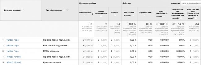Дополнительно в отчеты вывели возможность оценивать эффективность источников трафика в разрезе типов оборудования. Для этого при создании сделки в CRM менеджеры отмечают тип продукта, которым интересуется клиент, а из CRM в отчет эта информация передается в специальном параметре.