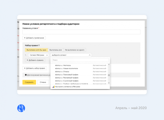 Рекомендую ограничивать период выборки аудитории ретаргетинга с помощью создания набора правил из сегмента и цели Метрики. Например, «Выполнены все»: Сегмент Метрики «Неотказы» и цель Метрики «Посетил сайт за 30 дней». Другой вариант — два набора правил: набор № 1 «Выполнено хотя бы одно» по сегменту «Неотказы» и набор № 2 «Не выполнено ни одного» по конверсионной цели Метрики за 30 дней.