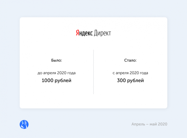 снизил минимальную сумму пополнения счета в Директе до 300 рублей без учета НДС. Ранее сумма составляла 1000 рублей без НДС. Это изменение — одна из мер, направленных на поддержку малого бизнеса. Кроме того, рекламодатели могут получить бонусы на размещение в Директе, для этого нужно ознакомиться с условиями и заполнить форму.
