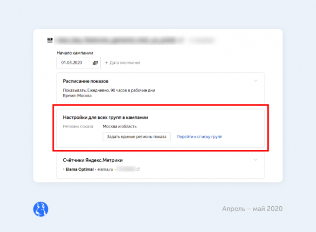 вернулась на уровень кампании. С января 2020 года задать регион показов можно было только на уровне групп объявлений, а для всей кампании — через массовые действия.