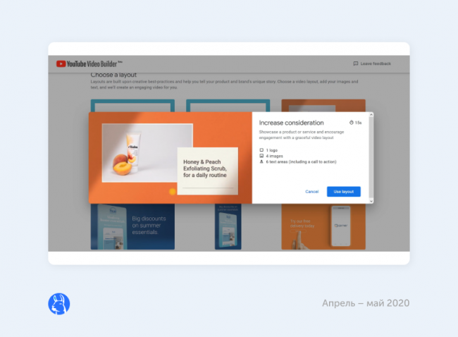 запустил видеоконструктор YouTube Video Builder. С его помощью можно создать рекламный ролик из статичных элементов: изображений, текста и логотипа — а также наложить аудиодорожку из библиотеки. В конструкторе есть макеты для разных целей и задач, рекламодатели могут изменить цвета и шрифт. Длина ролика — 6 или 15 секунд.