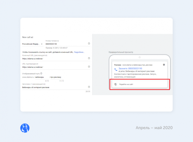 В некоторых проектах, с которыми я работал, это приводило к низкой конверсии из клика по номеру в объявлении в звонок. С помощью новинки от Google мы можем дать пользователям явный выбор между звонком и переходом на сайт, поэтому советую использовать эту возможность.