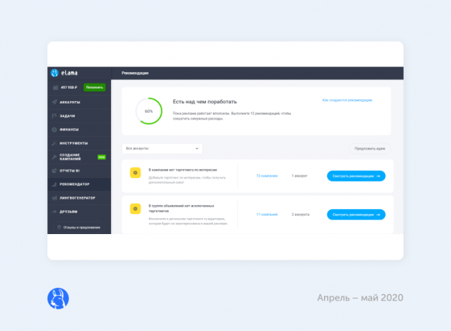 Рекомендатор — инструмент eLama, который анализирует рекламные кампании, находит ошибки и подсказывает, как их исправить. В апреле стали доступны 14 новых рекомендаций для кампаний в Google Ads: например, теперь рекомендатор находит объявления без номера телефона, дополнительных ссылок или исключенных интересов. Также теперь инструмент переехал на отдельную вкладку в меню.