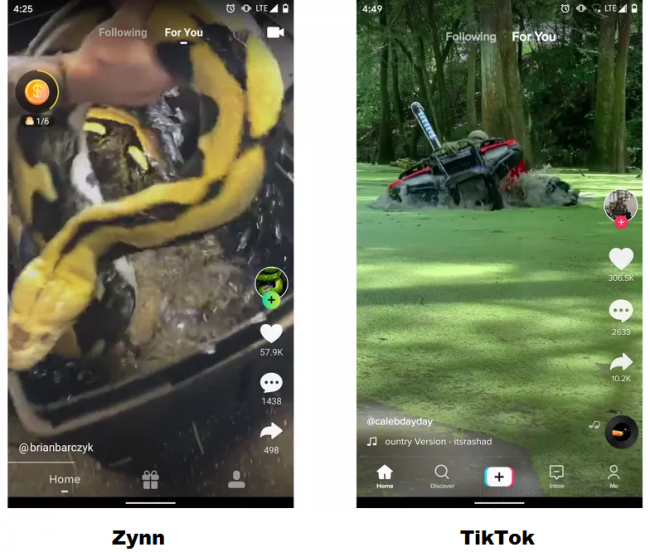 Zynn представляет собой клон TikTok, и интерфейс этих двух приложений идентичен вплоть до кнопок. Zynn отличается от последнего только тем, что платит пользователям.
