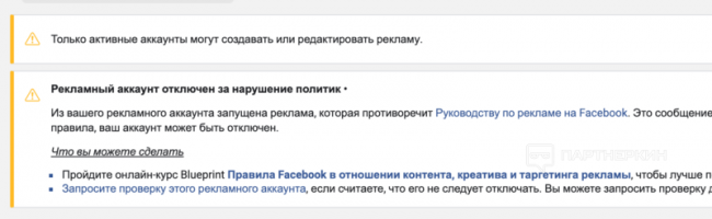 Тут уже сложнее, ваши кампании все еще крутятся, но вы уже не сможете запускать новую рекламу, управлять действующей, а также не сможете создавать рекламный кабинете и БМы. Решение все то же – подавайтесь на разбан с тем же месседжем. Вероятность выйти сухим из воды ниже, но, как правило, такие ограничение тоже легко снимают.