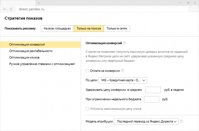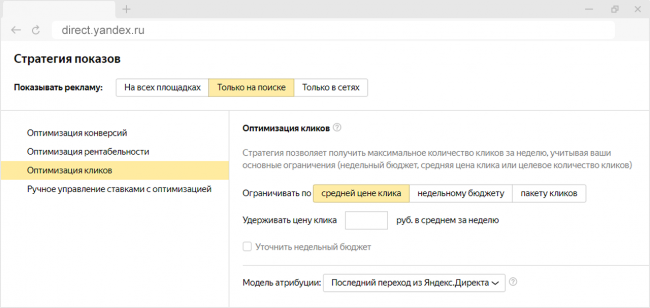 Решили протестировать автоматические стратегии. На тот момент нам не подходила стратегия «Оптимизация конверсий»: возможность интеграции CRM с Метрикой временно отсутствовала. Поэтому подключили стратегию «Оптимизация кликов».