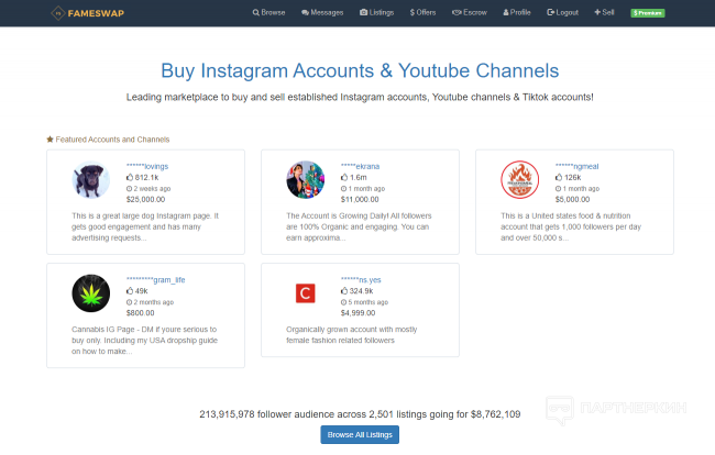 Fameswap — один из старейших маркетплейсов для покупки-продажи TikTok- и Instagram-аккаунтов, а также YouTube-каналов. Платформа имеет огромную базу покупателей в более чем 50 странах. Ежедневно крупные бренды, блогеры и маркетинговые агентства используют Fameswap для поиска своего «идеального претендента». На данный момент на платформе размещено более 2 500 аккаунтов/каналов с общим числом подписчиков в размере 213 915 978 человек. Стоимость всех аккаунтов составляет $8 762 109. Как работает Fameswap Принцип работы маркетплейса достаточно прост: Продавец добавляет свой аккаунт/канал на платформу и устанавливает начальную цену (модераторы Fameswap проверяют лоты перед тем, как они появляются в общем списке и поиске). Потенциальный покупатель связывается с продавцом, обсуждает все детали (история аккаунта, способы монетизации, перспективы). Покупатель делает предложение о покупке, и, если обе стороны сходятся в цене, совершается транзакция при помощи эскроу-счета. Покупатель получает аккаунт, продавец — деньги. Готово. Преимущества Fameswap Подтвержденная статистика. Вся информация об аккаунтах берется прямиком из учетных записей. Fameswap, в свою очередь, постоянно мониторит предложения для получения точной информации. Безопасное общение. Все переписки ведутся через защищенную платформу обмена сообщениями. Шифрование платежей. Fameswap сотрудничает с банками и обеспечивает своих клиентов безопасными платежами. Время на осмотр. После того, как транзакция совершена, деньги покупателя удерживаются на эскроу-счетах до тех пор, пока он не подтвердит, что купленный аккаунт/канал соответствует всем договоренностям. У покупателей есть «инспекционный период», во время которого он может задавать необходимые вопросы продавцу. Безопасная передача аккаунта. Когда сделка будет завершена, команда Fameswap передаст вам всю сопутствующую информацию. С этого момента вы являетесь новым владельцем аккаунта/канала. Много перспективных и свежих Instagram-лотов. Поддержка 24/7. Недостатки Fameswap Система диалогов. Несмотря на наличие защищенной платформы обмена сообщениями, ей еще очень далеко до идеала. К примеру, диалоги отображаются не по дате последнего сообщения, а по дате первого. Самые свежие сообщения могут оказаться на самом «дне» переписок. Кидалово. К сожалению, без этого никуда. Многие продавцы не имеют (скрывают, что не имеют) original mail, на который зарегистрирован предлагаемый аккаунт. С помощью этой почты продавец может вернуть проданный аккаунт через запрос в саппорт. В других случаях продавцы имеют original mail, но не имеют сим-карту, на которую была зарегистрирована почта — отсюда вытекает невозможность сменить пароль в будущем. Хороший гарант такое не пропустит — и это следующий пункт. Гарант. Если рассматривать Fameswap в качестве гаранта, то данная платформа — не самый лучший вариант для РУ вебмастеров, поскольку принимает только wire tranfser. Отправлять такой перевод из российских банков или платежных систем на юридическое лицо почти нереально, там нужен договор (его Fameswap не предоставляет). Альтернативой может послужить форум epicnpc.com, где гарантами выступают физические лица, самостоятельно меняющие пароли на почтах и аккаунтах, а также убирающие защиту с original mail. Передача аккаунта проходит с минимальными рисками. Мало годных YouTube-каналов. В отличие от Instagram, привлекательных Ютуб-каналов на