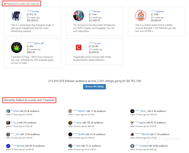 На данный момент на платформе размещено более 2 500 аккаунтов/каналов с общим числом подписчиков в размере 213 915 978 человек. Стоимость всех аккаунтов составляет $8 762 109.