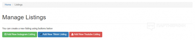 Следующая вкладка — «Listings». Здесь продавцы добавляют свои аккаунты/каналы на платформу.