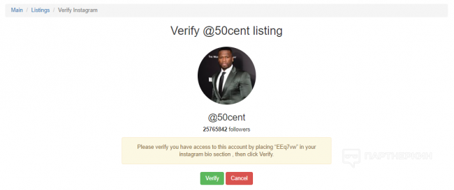 Процесс добавления предельно прост. Жмем на интересующую соцсеть, вводим имя аккаунта и, если оно удовлетворяет требованиям и условиям использования платформы, следуем инструкции: вводим текст в био своего профиля и жмем «Verify»: