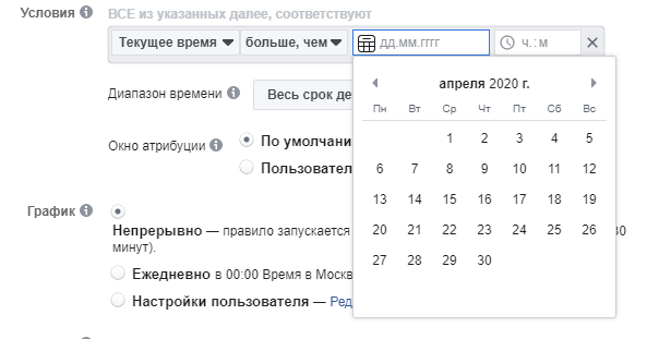 Показ рекламы по графику доступен только при работе с бюджетами на весь срок действия, но при помощи правил можно настроить график показа и для кампаний с дневным ограничением по бюджету.