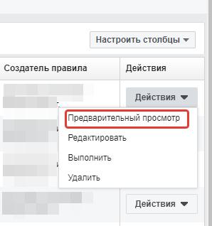 На странице вы увидите список правил, созданных в аккаунте. Напротив правила, которое вы хотите проверить, выберите «Действия — Предварительный просмотр».