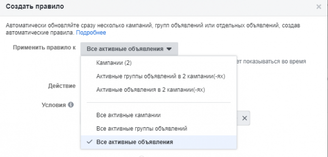 В открывшемся окне указываем, что мы хотим применить правило ко всем активным объявлениям в кампаниях.