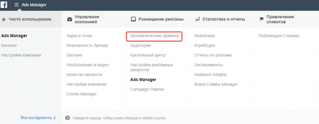 Для этого нужно открыть верхнее меню в Facebook Ads и выбрать «Автоматические правила».