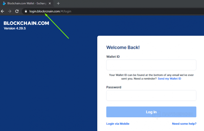 Открываем его, и нас автоматически перекидывает на фишинговый сайт. Ресурс внешне ничем не отличается от официального, только в домене изменили три буквы «kch» на «rcn». Вместо «blockchain.com» - «blockrcnain.com»:
