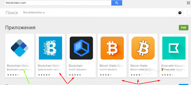 Давайте проверим, есть ли фейковые приложения того же Blockchain кошелька. Вводим его в поиске, и видим на первом месте официальное приложение и еще несколько неизвестных: