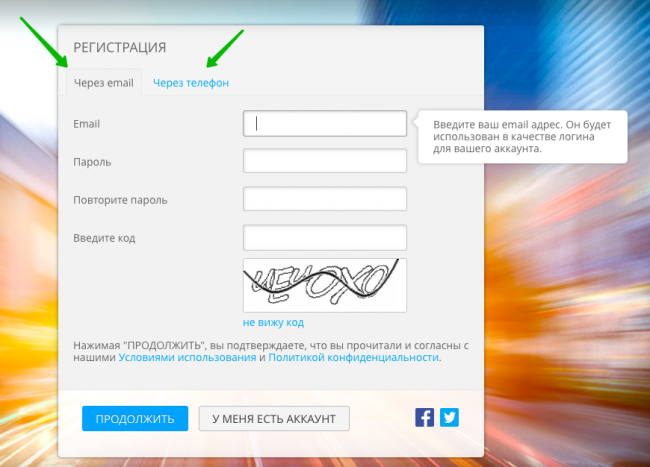 Выбираем способ регистрации, заполняем необходимые данные и нажимаем «Продолжить».
