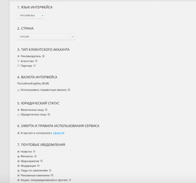 Выбираем язык интерфейса, страну, тип аккаунта (для основных функций будет достаточно аккаунта рекламодателя), юридический статус, принимаем оферту, выбираем уведомления, которые хотим получать на почту.