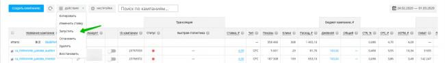 Здесь находятся созданные кампании, их статус и краткая статистика по ним. В этом же разделе мы создаем новые кампании, меняем ставки и применяем массовые изменения. Для массовых изменений выбираем кампании, поставив галочку, нажимаем действия, выбираем необходимое действие, например «Запустить ранее остановленные кампании».