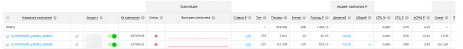 После этого видим, что в соответствующих строках поменялись иконки и появились новые значения, обозначенные синим, которые мы можем поменять, не переходя в кампанию, например, ставка, бюджет.