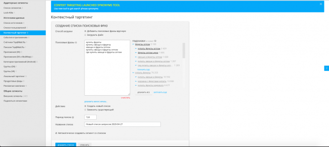 Одна из возможностей — настроить контекстный таргетинг по запросам. С помощью этого инструмента рекламодатель может отфильтровать пользователей по их запросам и поведению в поиске внутри и за пределами соцсетей: приложений («Юла», Pandao, «Все аптеки») и контентных проектов («Леди Mail.ru», «Дети Mail.ru», «Авто Mail.ru» и другие).