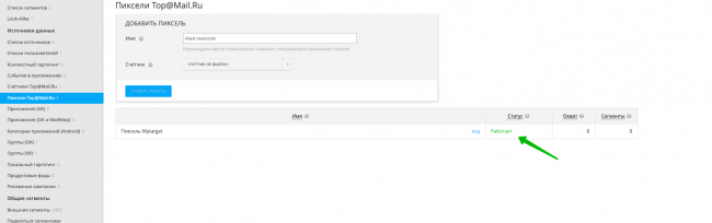 Затем нужно установить полученный код на сайт, отправить запрос на привязку и создать пиксель на основе счетчика. Если мы все сделали верно, то увидим статус «Работает» и сможем использовать аудиторию, собранную пикселем, в настройках таргетинга при создании кампаний.