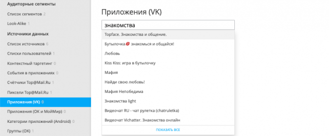 При создании аудиторий в myTarget также можно создавать сегменты тех, кто пользуется определенными приложениями, категориями приложений во «ВКонтакте», «Одноклассниках», «Моем Мире» или совершает в них определенные действия. Это позволит увеличить охват потенциальной аудитории.