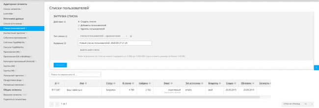 Один из эффективных способов таргетинга — показ рекламы по списку пользователей. Для этого нужно загрузить в систему список с данными пользователей: их ID в соцсетях, список телефонных номеров или почт.