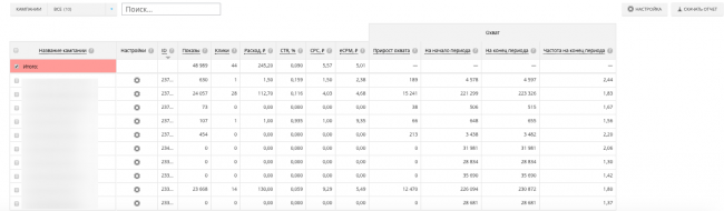 На вкладке «Статистика» представлены основные данные о CTR, CPC, показах, кликах, расходе в разрезе кампаний.