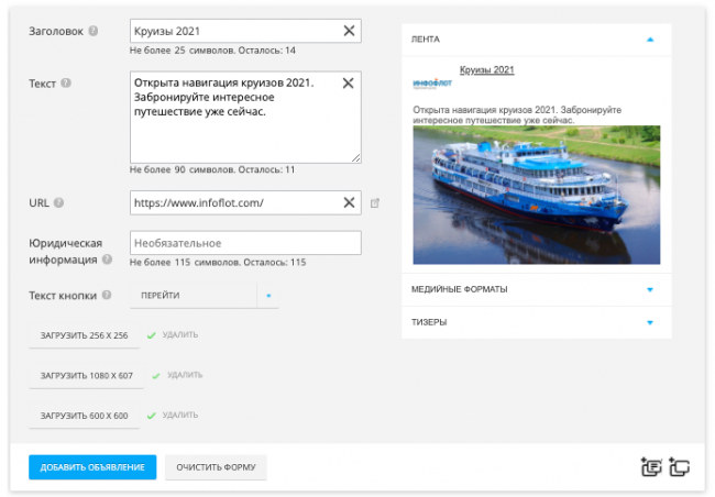 Чтобы создать такое объявление, понадобится добавить заголовок, текст, подходящие по количеству символов, URL и три изображения с разрешением 256?256, 1080?607, 600?600.