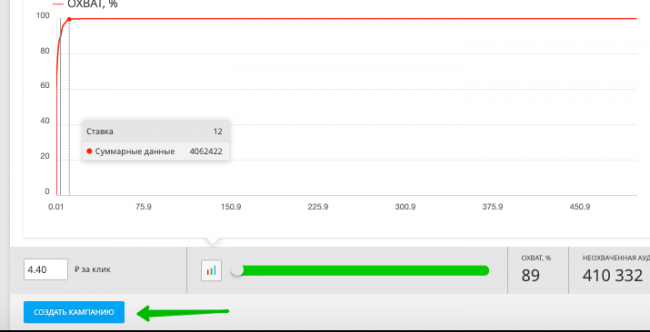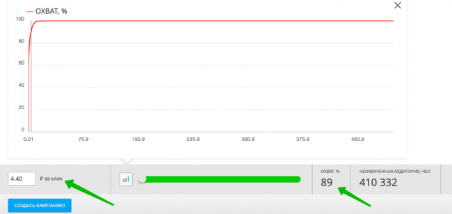 Нажимаем «Добавить кампанию» и выбираем цену за клик. На графике видим зависимость цены клика и процент охваченной аудитории. Видим, что не стоит задавать слишком высокую цену клика.
