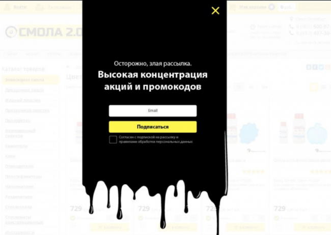 Вот еще один пример формы. Он довольно спорный. С одной стороны, форма креативная, необычная и может поднять настроение. С другой — здесь нет крестика, чтобы закрыть форму, а также чекбокса для согласия на сбор данных.