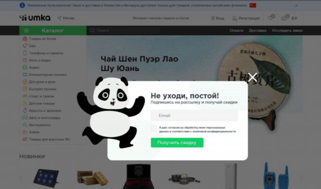 Вот другая форма этого же магазина. Здесь польза рассылки четко обозначена. Крестик ярче и заметнее. Обычно человек начинает воспринимать текстовую информацию на форме только когда найдет глазами крестик.