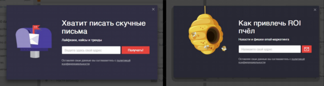 Вот два варианта всплывающих форм, которые мы тестировали в течение трех месяцев. Та, что слева, работала с конверсией около 3,2%, а вторая — 0,3%. Вероятно, вторая форма имела меньшую конверсию из-за того, что не всем пользователям было понятно сообщение, например, кто-то не знал, что такое ROI.
