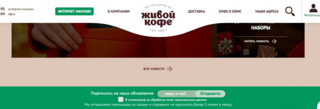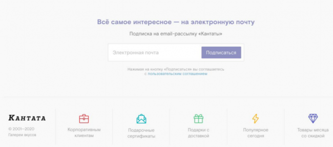 Статичные формы чаще располагают в подвале сайта — в футере, куда многие пользователи не доходят. Призыв обычно содержит в себе просьбу оставить email, чтобы получать рассылку, пользователю при этом непонятно, какую выгоду он получит. Вот пример такой формы.
