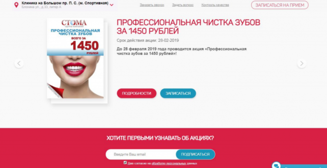 Форма несколько спорит с основным контентом на странице. Из-за того, что футер с формой для подписки такой яркий, мы больше уделяем внимание ему, чем акции, о которой говорится на странице, хотя получить клиентов на профессиональную чистку зубов для стоматологической клиники важнее, чем получить подписчиков.