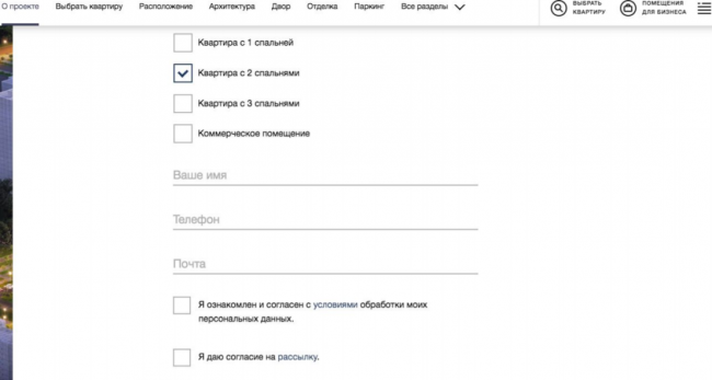На сайте этого же застройщика есть форма подписки с призывом быть в курсе. Там пользователь должен выбрать тип недвижимости, который его интересует, и уже затем оставить свои контакты.