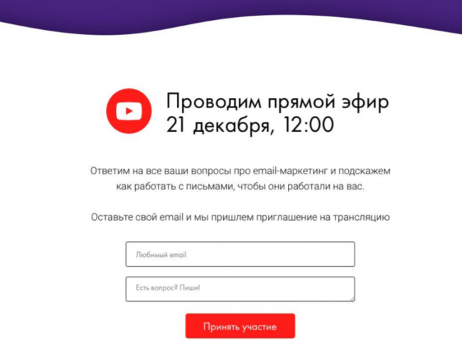 В прошлый новый год мы вели праздничную трансляцию и отвечали в прямом эфире на вопросы пользователей. Чтобы посмотреть трансляцию, пользователь должен был оставить адрес электронной почты