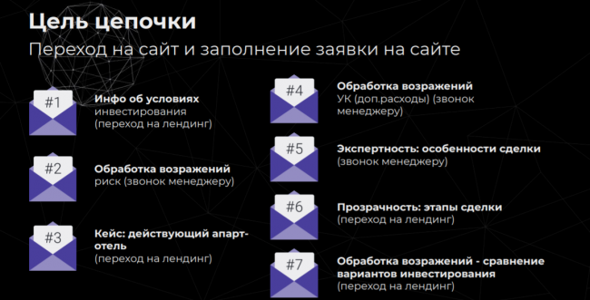 Возьмем такой пример: мы хотим, чтобы пользователь перешел на сайт и заполнил заявку на инвестирование в апарт-отель. Инвестиции — сложный продукт, поэтому подводить пользователя к целевому действию нужно постепенно. Мы запускаем серию welcome-писем по одному в неделю, у каждого письма — своя цель. Вот так строилась цепочка: