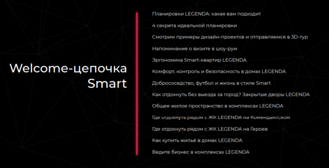 Ниже — темы писем welcome-серии от застройщика. Основная задача — ответить на основные вопросы и привести уже подогретого пользователя в офис продаж.