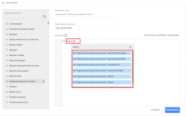 Видим свод данных, которые будут передаваться и использоваться в Data Studio, но при необходимости можно создать собственное поле (как это сделать, разберем ниже).