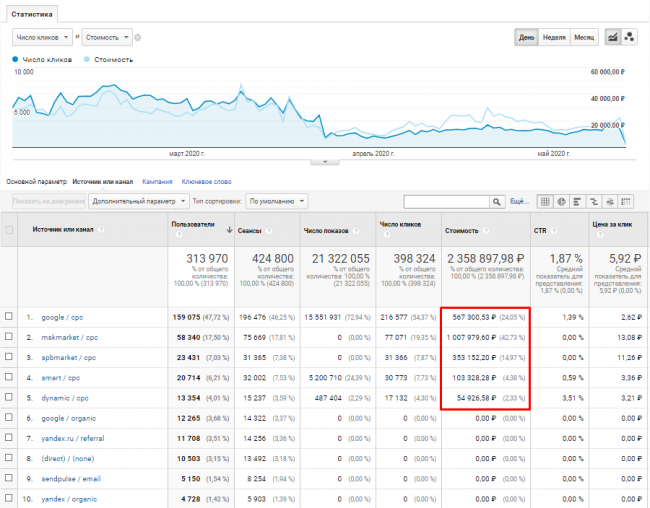 Если все сделано верно, в Analytics получим отчет по расходам.