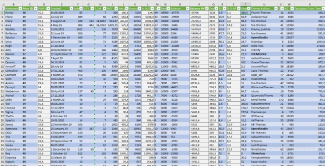 Мы перешли к изучению молодых лидеров рынка. Это важно, так как со стариками, продающимися на сайтах не 1 год, нам не тягаться. Биться за своё место под солнцем маркетплейсов шаблонов придётся с такими же новозагруженными шабами, а не с «ветеранами». Старичков учитывали лишь в том плане, сколько они зарабатывали за большой срок жизни шаблона и не более того. Их дизайн часто бывает устаревшим, но выезжают за счет траста или повторных продаж.