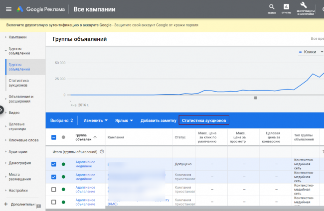 Чтобы открыть отчет можно в Google Ads, надо отметить нужные кампании, группы объявлений или ключевые слова и нажать «Статистика аукционов».