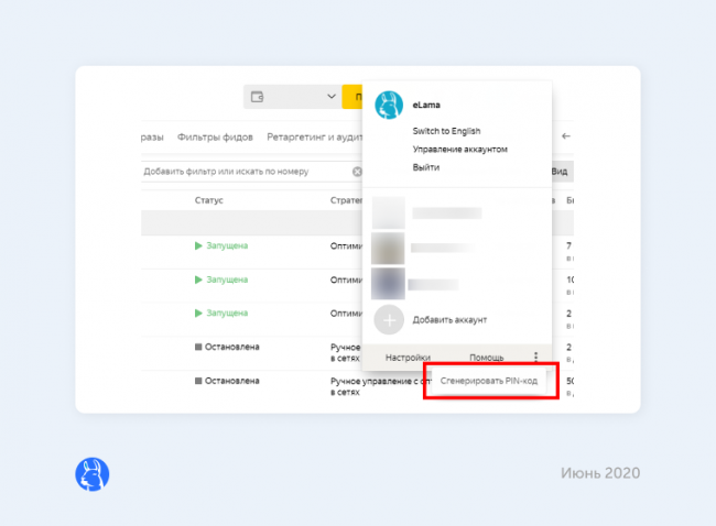 должны предоставить менеджеру клиентского сервиса Директа разовый пин-код. Он действует 15 минут и открывает доступ к кампаниям. Ссылка на пин-код находится в Яндекс.Паспорте в правом верхнем углу экрана в Директе. Нужно кликнуть по иконке с логином, затем по трем точкам рядом с разделом «Помощь» и нажать «Сгенерировать пин-код».