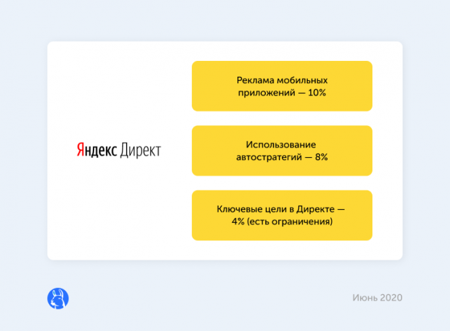 запустил бонусную программу за размещение рекламы в Директе. Рекламодатели смогут получить от 4 до 10% от бюджета рекламных кампаний, в которых используются настройки из условий программы. Для участия нужно подать заявку. Программа доступна для всех рекламодателей из России: и самостоятельных, и клиентов агентств. Бонусы копятся всё лето, они придут на баланс вместе с первым пополнением счета на любую сумму от 360 рублей после завершения акции в сентябре.