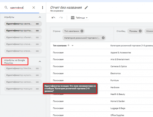 А в остальном, например, посмотреть тип кампании в разрезе товаров или по id так же нельзя, так как поле несовместимо со столбцом «Категория розничной торговли» (первый уровень).