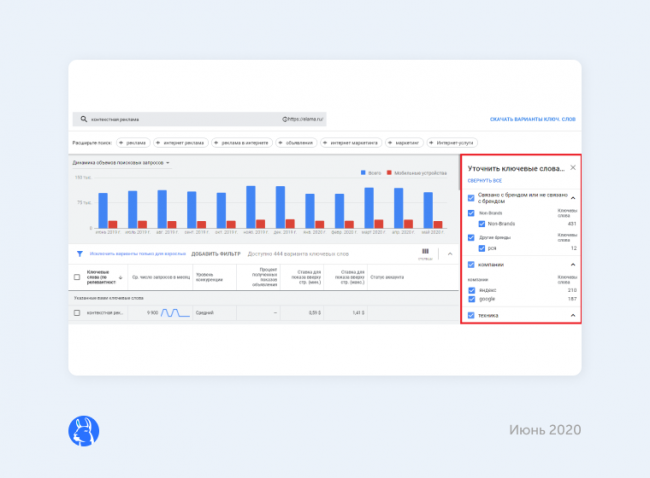 С помощью Планировщика ключевых слов можно подобрать новые ключевые слова для ваших рекламных кампаний, просмотреть статистику и прогноз данных по ним. Новая функция «Уточнить ключевые слова» позволяет массово отфильтровать ключи — она сортирует их по группам в зависимости от каких-либо параметров, и вы можете быстро просмотреть эти параметры и отметить нужные.