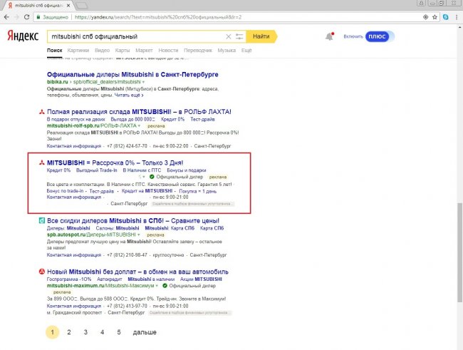 Прямые запросы — наиболее конкурентная и дорогая категория: «цена митсубиси», «автосалон мицубиси», «купить новый mitsubishi» и т. д.