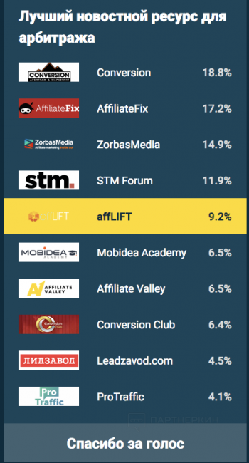 В последние 5 часов голосования команда Afftime заказала накрутку на 6 рандомных категорий. Номинантов выбирали из середины списка, чтобы не ломать рейтинг, и каждому из них накрутили по 100 голосов. И, угадайте, что произошло? Ничего. Наши 100 голосов никак не повлияли на результат. Максимальный сдвиг равнялся 0,8%, а в некоторых случаях цифры и вовсе не поменялись. А ведь 100 голосов — это совсем немало. У больших партнерок обычно не больше 4-5к активных пользователей, у мелких — и того меньше. И это при том, что голосуют далеко не все партнеры. Масштаб вероятной накрутки впечатляет.
